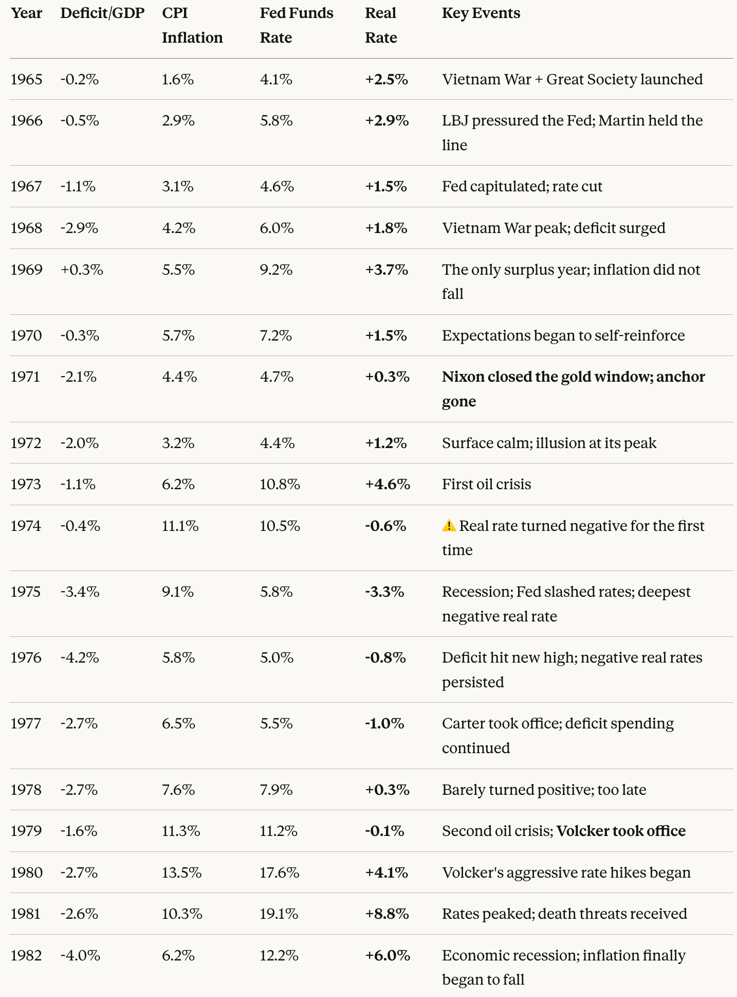 What is interesting is that the fiscal deficit of that era, by today's standards, was not large — yet it ultimately pushed interest rates above 10%. This may be related to psychological anchors: for example, the rapid economic development after WWII; the dollar had previously been pegged to gold. These anchors created a stark contrast with the situation after 1965. In China before 1980, who had ever seen a woman in a miniskirt? People were overwhelmed with excitement. Today, seeing one without is what seems unusual.