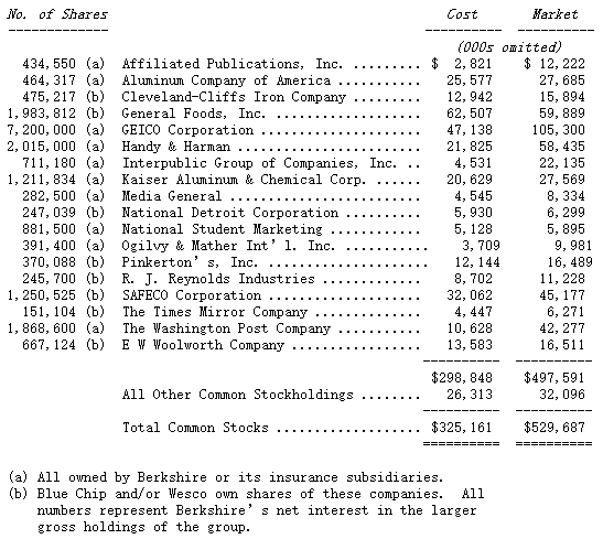 我们的保险公司将继续对那些经营良好、处境有利、但我们并不控制的公司进行大额投资,而这些公司往往只把其收益中的很小一部分以股息形式分配出来。沿着这项政策走下去,我们预期自己的长期回报将继续超过每年由报表经营收益所体现出来的回报。我们对这一判断的信心,其实很容易量化:如果我们把目前持有的股票全部卖掉,改为持有长期免税债券,那么我们报告出来的经营收益将立刻每年增加 3,000 多万美元。可这样的转换,对我们毫无诱惑。