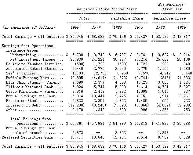 下表列示了 Berkshire 报告收益的来源。Berkshire 持有 Blue Chip Stamps 约 60% 的股权,而 Blue Chip Stamps 又持有 Wesco Financial Corporation 80% 的股权。该表同时列示了各个业务实体的合计收益,以及 Berkshire 在这些收益中所占的份额。归属于这些业务实体的所有重大资本利得与损失,都在表格底部的“已实现证券收益”项目中汇总体现,并未计入经营收益。我们对经营收益的计算还剔除了出售 Mutual 分支机构所得的收益。在这一点上,它不同于我们经审计财务报表中的列报方式;后者在计算 “Earnings Before Realized Investment Gain” 时,将这项收益包含在内。