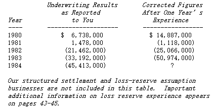 To help you understand this table, here is an explanation of the most recent figures: 1984's reported pre-tax underwriting loss of $45.4 million consists of $27.6 million we estimate that we lost on 1984's business, plus the increased loss of $17.8 million reflected in the corrected figure for 1983.
