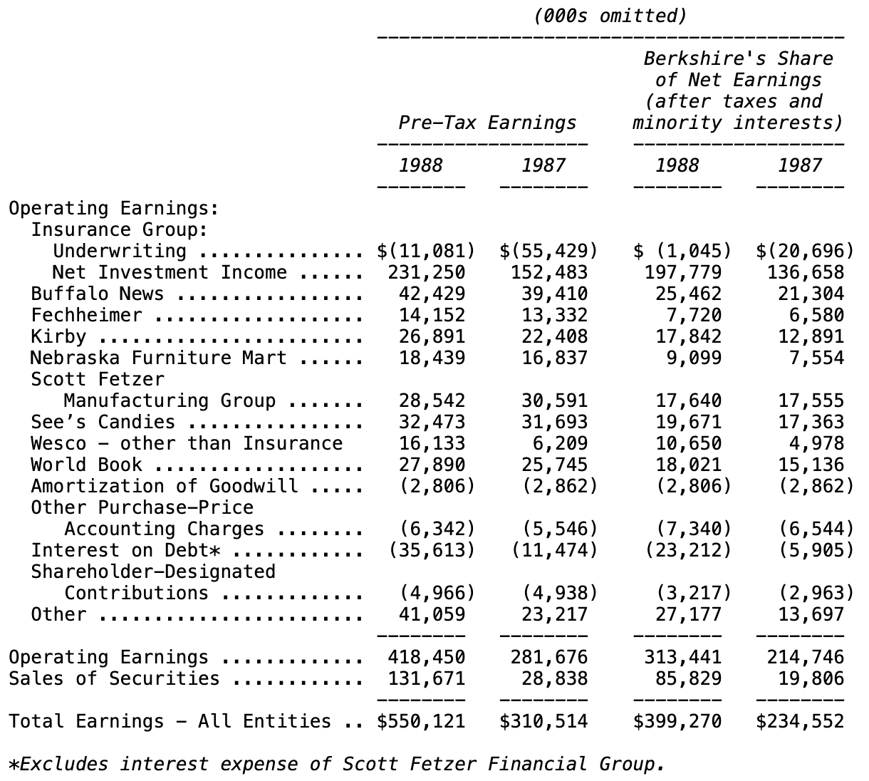 In the following table, amortization of Goodwill and other major purchase-price accounting adjustments are not charged against the specific businesses to which they apply but are instead aggregated and shown separately. This procedure lets you view the earnings of our businesses as they would have been reported had we not purchased them. I’ve explained in past reports why this form of presentation seems to us to be more useful to investors and managers than the standard GAAP presentation, which makes purchase-price adjustments on a business-by-business basis. The total net earnings we show in the table are, of course, identical to the GAAP total in our audited financial statements.