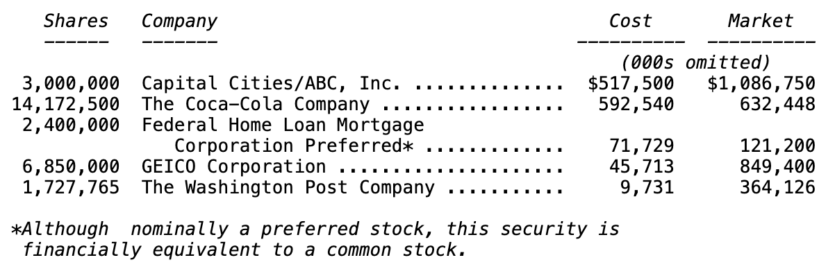Important negatives affecting our prospects today are: (1) a less attractive stock market than generally existed over the past 24 years; (2) higher corporate tax rates on most forms of investment income; (3) a far more richly-priced market for the acquisition of businesses; and (4) industry conditions for Capital Cities/ABC, Inc., GEICO Corporation, and The Washington Post Company—Berkshire’s three permanent investments, constituting about one-half of our net worth—that range from slightly to materially less favorable than those existing five to ten years ago. All of these companies have superb management and strong properties. But, at current prices, their upside potential looks considerably less exciting to us today than it did some years ago.