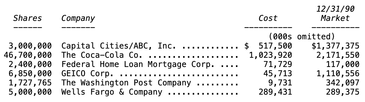 我们在1990年的增长率有些平淡,因为我们的四大普通股重仓股在总市值上几乎没有变化。去年我告诉过你们,尽管这些公司——Capital Cities/ABC、Coca-Cola、GEICO 和 Washington Post——拥有优良的业务和卓越的管理层,但人们对这些特质的广泛认可已将这四家公司的股价推向了极高的水平。自那以后,两家媒体公司的市场价格大幅下跌——原因在于行业发展的演变,这是有充分理由的,我稍后会讨论——而 Coca-Cola 的股价则大幅上涨,我也认为这是有充分理由的。总的来说,我们的“永久四大重仓股”在1990年年底的价格虽然远称不上诱人,但比一年前要稍微具有吸引力一些。