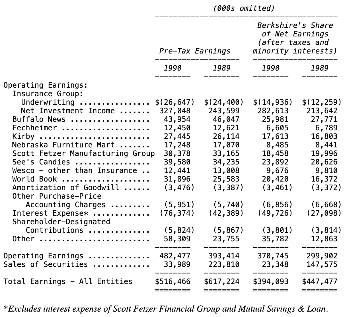 The table below shows the major sources of Berkshire’s reported earnings. In this presentation, amortization of Goodwill and other major purchase-price accounting adjustments are not charged against the specific businesses to which they apply, but are instead aggregated and shown separately. This procedure lets you view the earnings of our businesses as they would have been reported had we not purchased them. I’ve explained in past reports why this form of presentation seems to us to be more useful to investors and managers than one utilizing generally accepted accounting principles (GAAP), which require purchase-price adjustments to be made on a business-by-business basis. The total net earnings we show in the table are, of course, identical to the GAAP total in our audited financial statements.