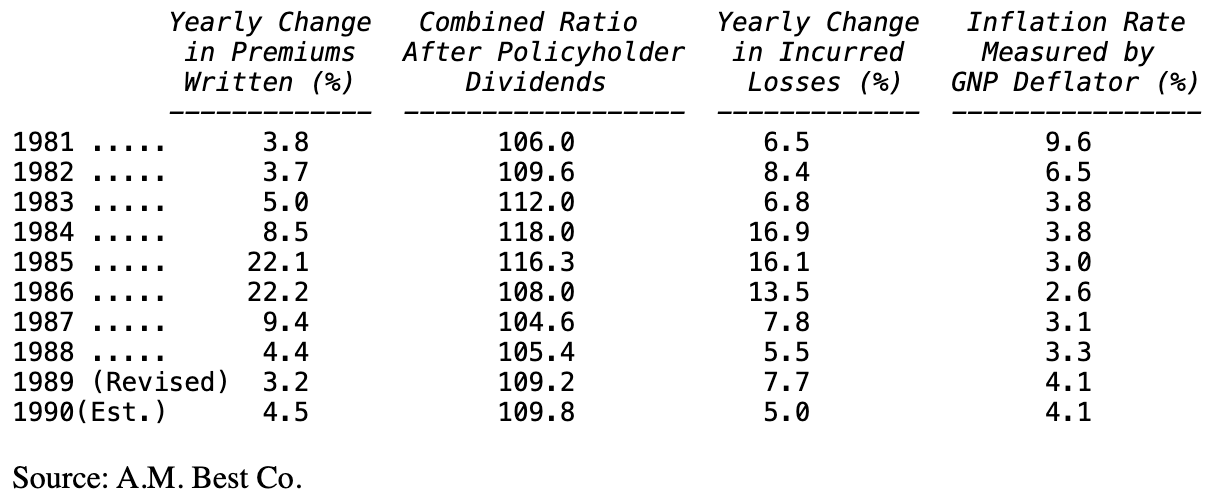 再看一眼第51页的数据,其中汇总了我们非保险业务的收益和资产负债表。1990年的平均净资产税后收益率为51%,这一结果可以使该集团在1989年的 Fortune 500 中排名第20位左右。