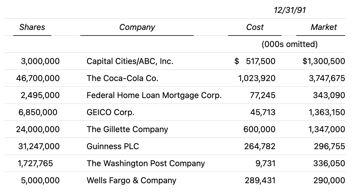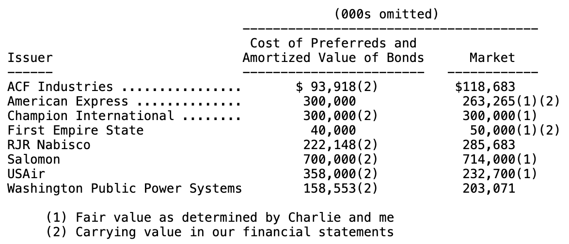 1991年,我们对固定收益投资组合做了几项重要调整。如我前面提到的,我们持有的 Gillette 优先股被赎回,迫使我们转换为普通股;我们清空了所持的某一期 RJR Nabisco 债券(该债券先是被纳入一次交换要约,随后又被赎回);我们买入了 American Express 与 First Empire State Corp.(一家位于 Buffalo 的银行控股公司)的固定收益证券。我们还增加了在1990年末建立的 ACF Industries 的小仓位。到年末,我们最大的持仓包括: