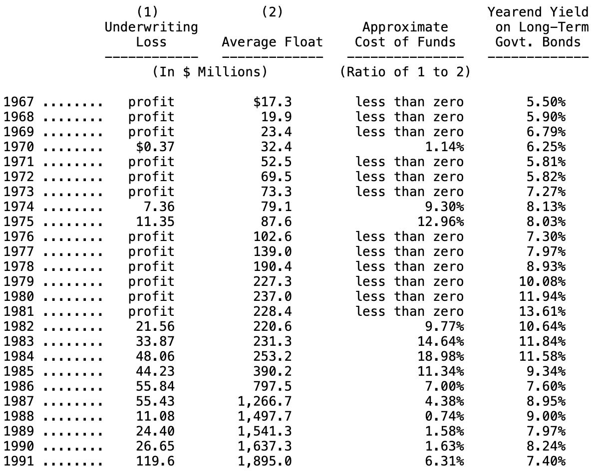 As you can see, our cost of funds in 1991 was well below the U. S. Government’s cost on newly-issued long-term bonds. We have in fact beat the government’s rate in 20 of the 25 years we have been in the insurance business, often by a wide margin. We have over that time also substantially increased the amount of funds we hold, which counts as a favorable development but only because the cost of funds has been satisfactory. Our float should continue to grow; the challenge will be to garner these funds at a reasonable cost.