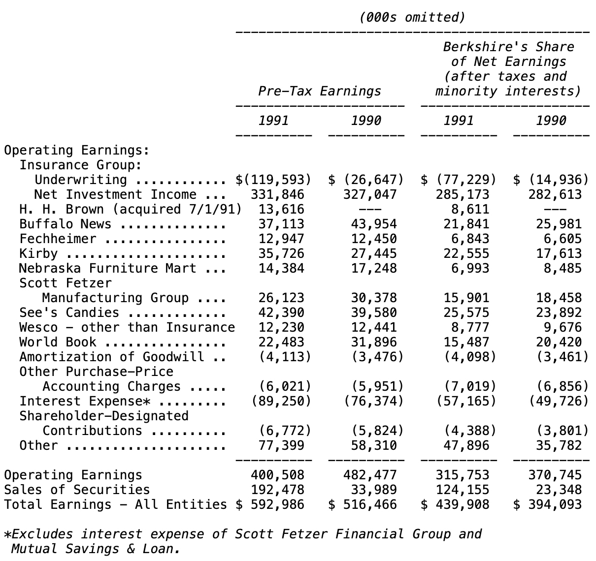 First, I told you that our media earnings—both direct and look-through—were “sure to decline” and they in fact did. The second force came into play on April 1, when the call of our Gillette preferred stock required us to convert it into common. The after-tax earnings in 1990 from our preferred had been about $45 million, an amount somewhat higher than the combination in 1991 of three months of dividends on our preferred plus nine months of look-through earnings on the common.