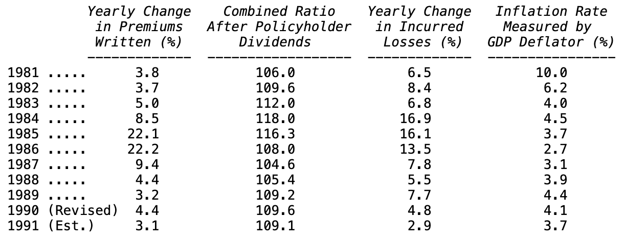 不过,当经营环境转差时,行业往往倾向于“少提准备金”(under-reserve),这可能会在一段时间内掩盖真实情况——而去年很可能就是如此。尽管保费增长远未接近10%,综合成本率却没有像我预期的那样恶化,反而略有改善。行业的赔付准备金数据表明,我们有理由对这一结果保持怀疑:1991年的比率最终可能会被证明本应比报告出来的更糟。从长期看,用会计手法粉饰经营问题的管理层,当然终究会遇到麻烦。这类管理层最终会得到和那个重病患者同样的结果——他对医生说:“我负担不起手术,但你能不能收点小钱,帮我把X光片修一修?”