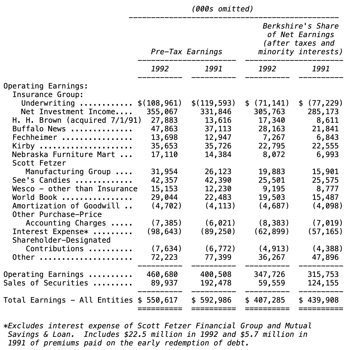 去年六月,我在任职十个月后卸任了 Salomon Inc 的临时董事长。从 Berkshire 1991—1992 年的业绩你可以看出,公司在我离开期间并没有想念我。但反过来并非如此:我确实想念 Berkshire,并很高兴全职回归。世上没有比经营 Berkshire 更有趣的工作,而我能在这个位置上自觉幸运。