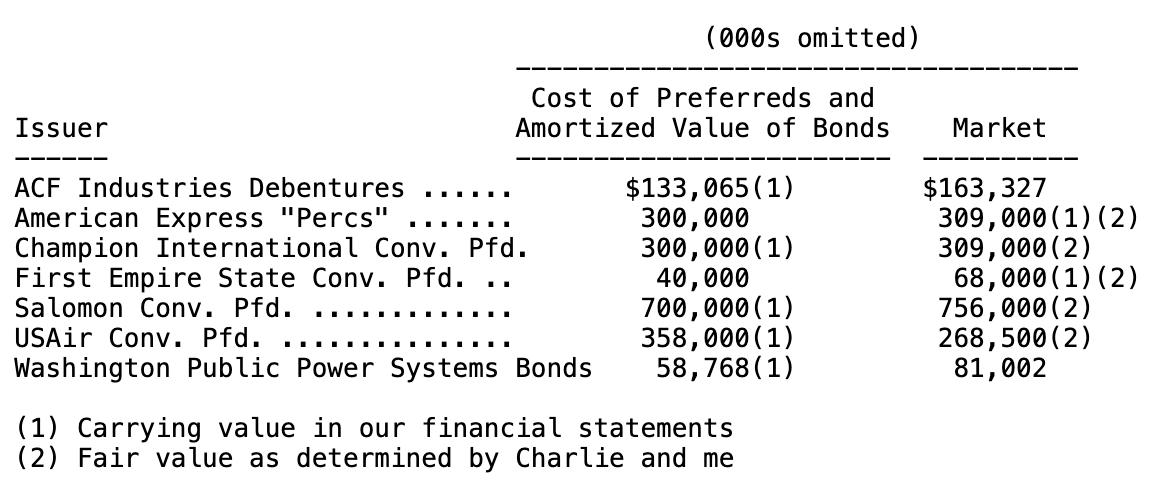 多年来,我们在固定收益投资上表现良好,既取得了可观的资本利得(包括1992年的8,000万美元),也获得了优异的当期收益。Chrysler Financial、Texaco、Time-Warner、WPPSS 和 RJR Nabisco 尤其是成功的投资。同时,我们在固收方面的亏损微乎其微:惊险不少,但至今没有“翻船”。