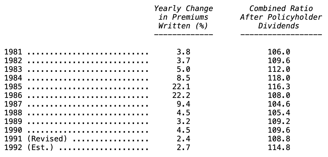 在去年的报告中,我告诉你我希望我们的巨灾业务长期能实现10%的利润率。但我也提醒过你:在任何特定年度,这项业务很可能“要么大赚、要么大亏”。然而,1991和1992两年都接近盈亏平衡。尽管如此,我仍将这些结果视为偏离常态,并坚持我的判断:这项业务的年度盈利性将出现巨大的波动。