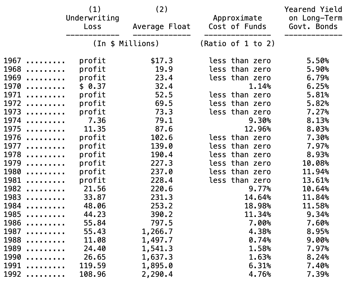 正如我在过去几年的每次报告中所说,我们保险业务中关键的是“由保险形成的资金成本”,或者通俗点说,“float 的成本”。所谓 float——我们能以异常可观的规模产生——等于赔款准备金、理赔费用准备金与未赚保费准备金之和,减去代理人应收款、预付获取成本以及与分入再保险相关的递延费用。float 的成本以我们的承保亏损来衡量。