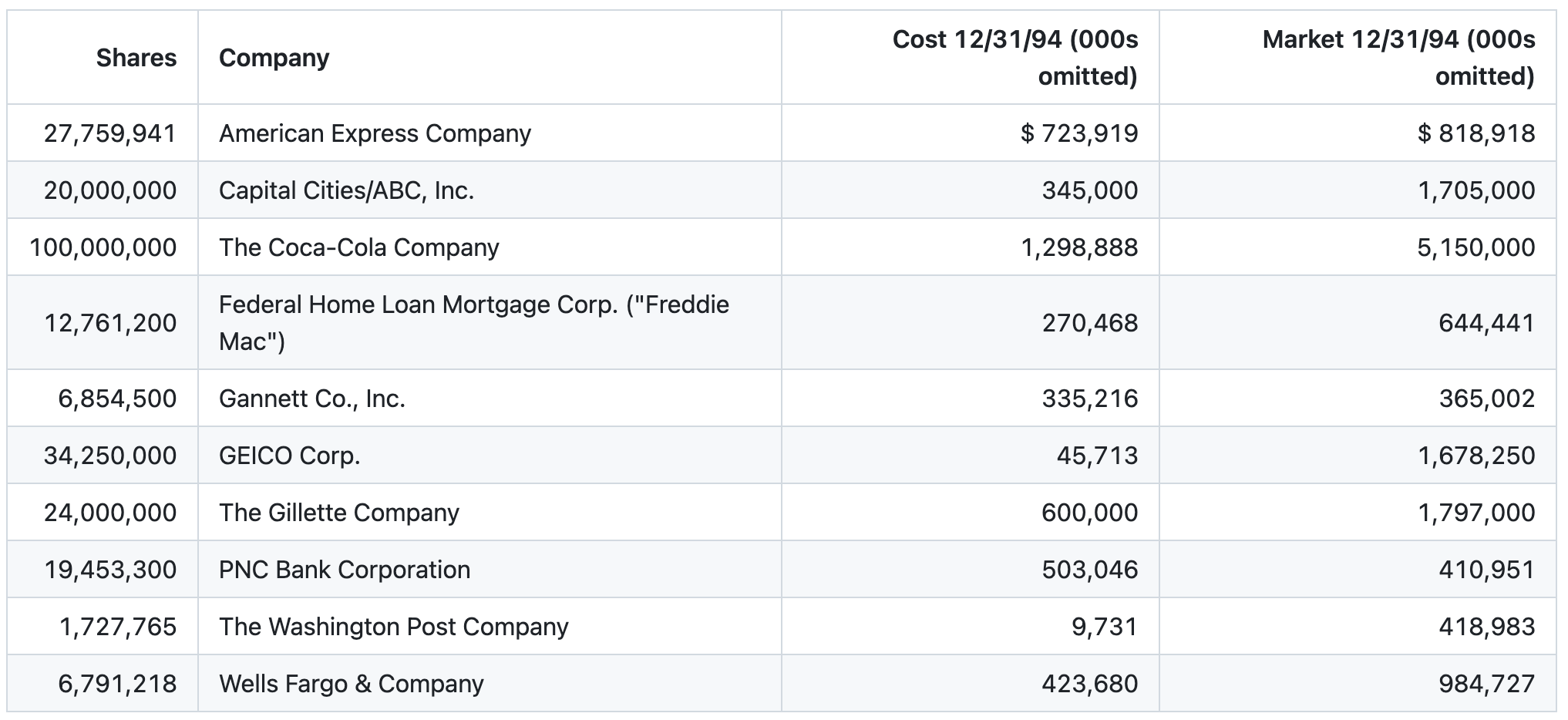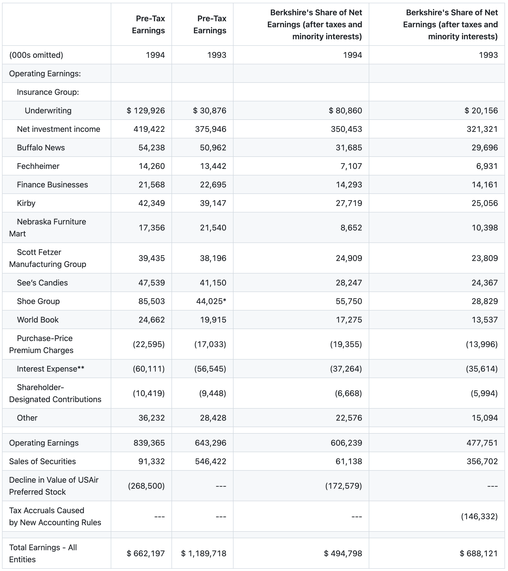 时至今日,我们持有的股票投资组合价值超过180亿美元,每股约15,000美元。若是我们再次将这些股票投资所产生的收益扣除的话,我们在1994年的税前收益是3.84亿美元。十年来,雇佣的员工人数从原来的5,000人增加到22,000人(包含总部的11人在内)。