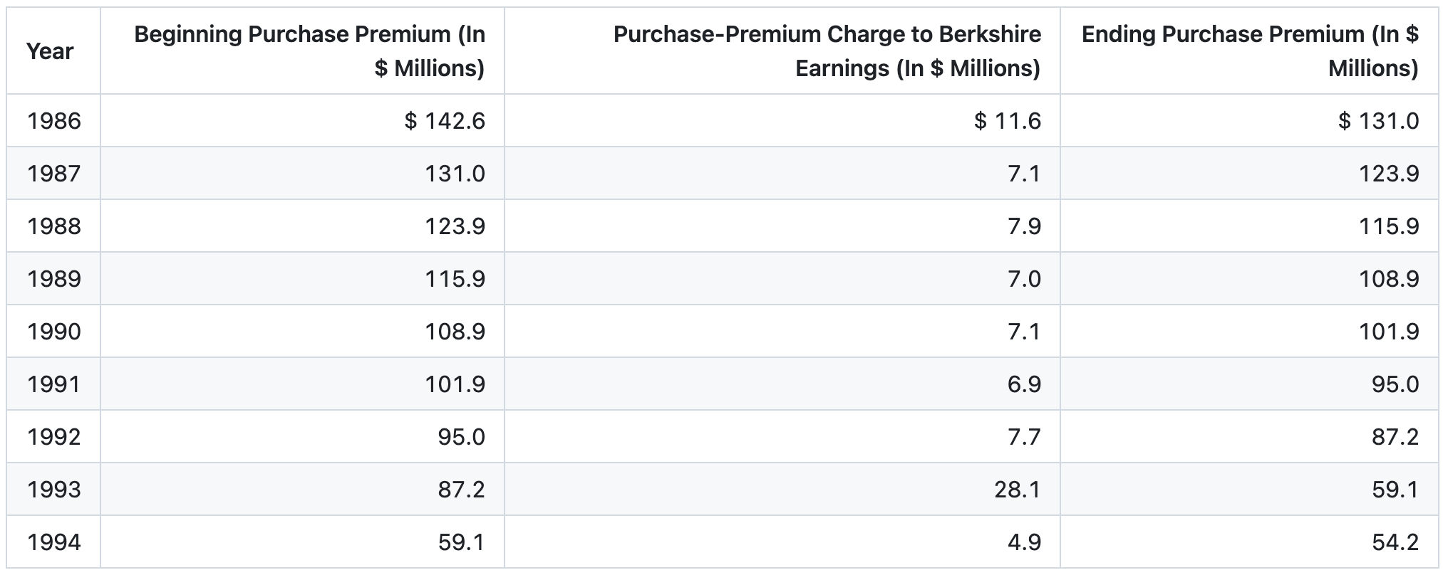 接下来是之前说过的会计课,我们支付的超过ScottFetzer帐面价值1.426亿美元的溢价,将会被记录在伯克希尔的资产负债表上,详细的细节我在此省略(伯克希尔1986年致股东信的附录部分有详细解释),直奔主题:这些溢价在入账之后,不管怎样都必须当作成本按年摊销,并计入每年的损益表内。