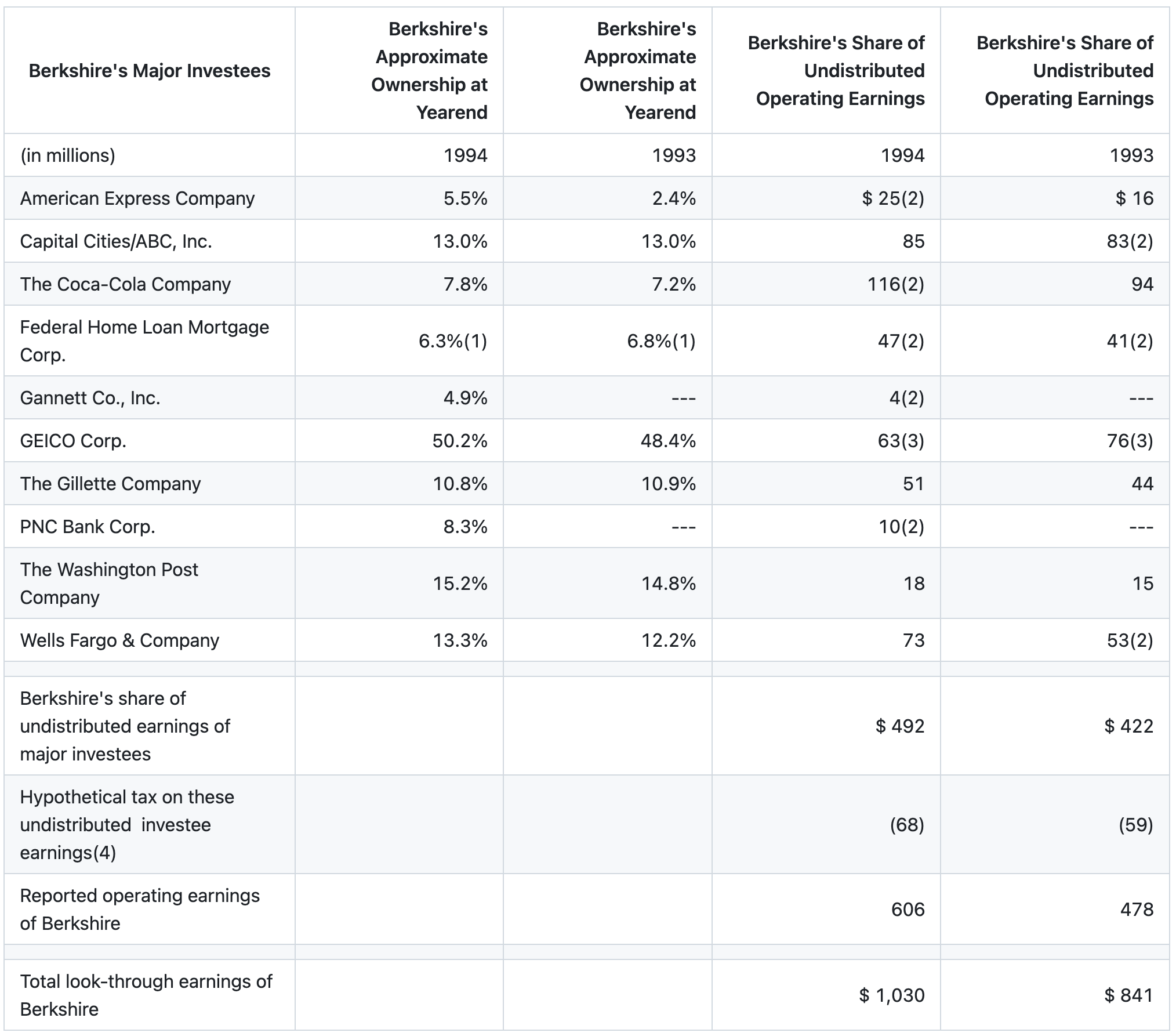 我们持有少数股权企业的贡献,对伯克希尔来说也功不可没。从一些统计数字中,可以看出他们的重要性:1994年可口可乐总计卖出2,800亿罐八盎司饮料,每罐大概能赚一美分。不过积沙成塔。若按伯克希尔拥有7.8%可口可乐的股权比例,我们大概可以分配到210亿罐,总计光是软饮料贡献给我们的收益就有二亿美元。同样的,通过对吉列的持股,伯克希尔大概可以分得全世界刮胡刀7%的市场份额(以营收而非销量计算),约为2.5亿美元的销售额。另外在拥有530亿美元资产的富国银行,我们持有13%的股权大概就等于是一家拥有70亿美元资产的伯克希尔银行,它每年盈利大约一亿美元。