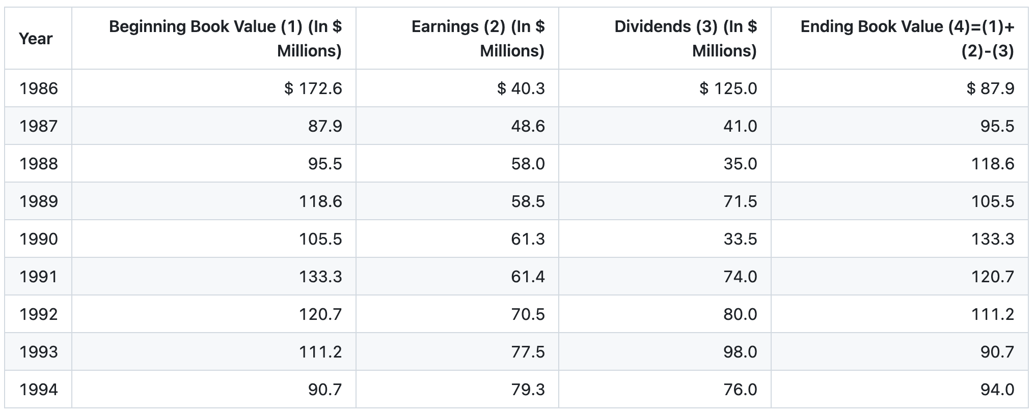 下表列示自我们买下ScottFetzer后,历年来的帐面价值以及它的利润与股息: