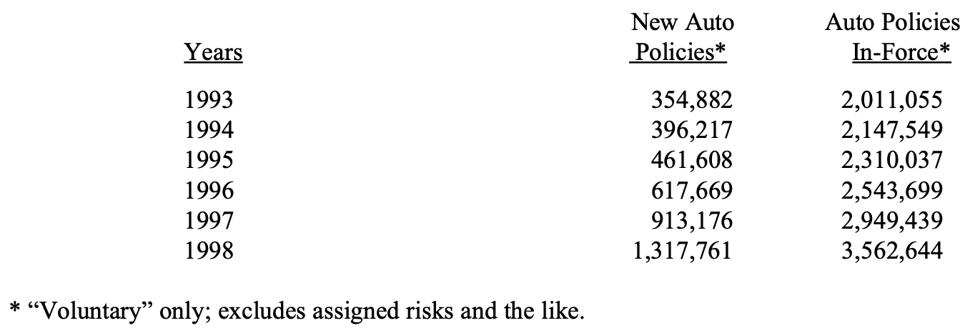 尽管 GEICO 的数据令人惊叹,但我们要做的还很多。我们在 1998 年的市场份额确实显著提高——但也只是从 3% 提升到 3.5%。我们现在每拥有 1 位保单持有人,外面还有另外 10 位本该把业务交给我们。