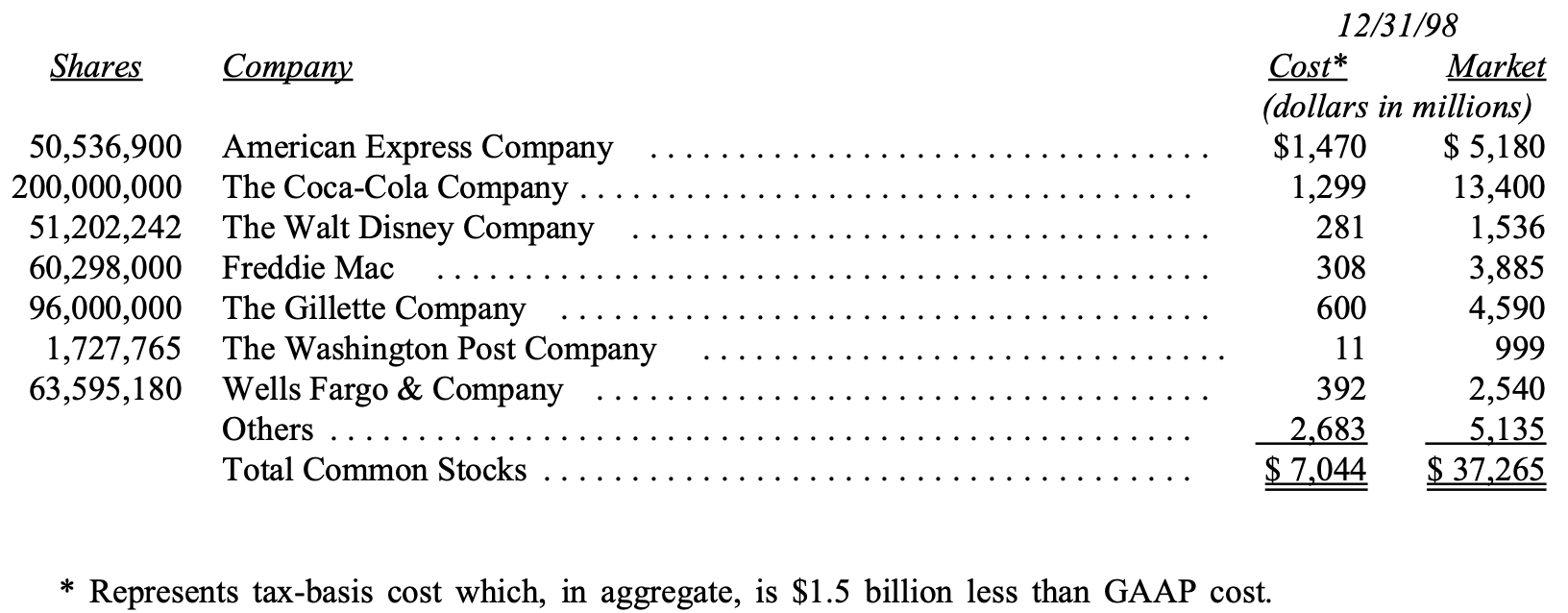 Our financial growth has been matched by employment growth: We now have 47,566 on our payroll, with the acquisitions of 1998 bringing 7,074 employees to us and internal growth adding another 2,500. To balance this gain of 9,500 in hands-on employees, we have enlarged the staff at world headquarters from 12 to 12.8. (The .8 doesn’t refer to me or Charlie: We have a new person in accounting, working four days a week.) Despite this alarming trend toward corporate bloat, our after-tax overhead last year was about $3.5 million, or well under one basis point (.01 of 1%) of the value of the assets we manage.