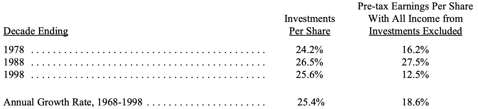 在过去三份年报里,我们都提供了一张表格,我们认为它对于估算 Berkshire 的内在价值至关重要。在这张更新后的表格(见下文)中,我们追踪两项关键的价值构成,并将 General Re 以备考(pro-forma)口径纳入,假设我们在全年都持有它。第一列列示我们按每股口径拥有的投资资产(包括现金及等价物,但不包括我们金融产品业务中持有的证券);第二列显示 Berkshire 运营企业的每股税前盈利(未计入购买会计调整——见第 62–63 页——但已扣除所有利息与总部费用)。第二列不包含来自第一列投资资产的任何股息、利息与已实现资本利得。换句话说,这两列等于把 Berkshire “拆成两半”来看:一家公司只持有投资资产,另一家公司负责经营所有业务并承担全部总部成本。