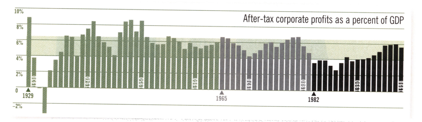 As we focus on those two numbers, we need to be aware that the profits figure has its quirks. Profits in 1998 included one very unusual item–a $16 billion bookkeeping gain that Ford reported from its spinoff of Associates–and profits also included, as they always do in the 500, the earnings of a few mutual companies, such as State Farm, that do not have a market value. Additionally, one major corporate expense, stock-option compensation costs, is not deducted from profits. On the other hand, the profits figure has been reduced in some cases by write-offs that probably didn’t reflect economic reality and could just as well be added back in.