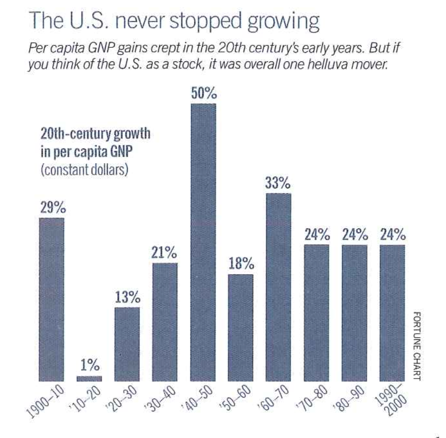 当然,这个世纪也包含一些非常艰难的年份——如 1929 至 1933 年的大萧条。但如果逐十年观察人均 GNP,会发现一个显著现象:作为一个国家,我们在整个世纪中总体保持了相对一致的进步。因此,你也许会以为美国的经济价值——至少按证券市场来衡量——会以相当一致的速度增长。
