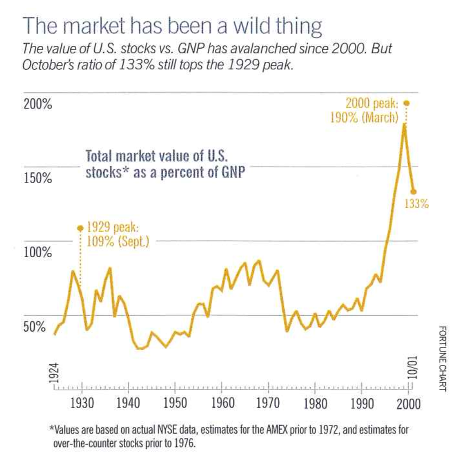 On a macro basis, quantification doesn't have to be complicated at all. Below is a chart, starting almost 80 years ago and really quite fundamental in what it says. The chart shows the market value of all publicly traded securities as a percentage of the country's business--that is, as a percentage of GNP. The ratio has certain limitations in telling you what you need to know. Still, it is probably the best single measure of where valuations stand at any given moment. And as you can see, nearly two years ago the ratio rose to an unprecedented level. That should have been a very strong warning signal.