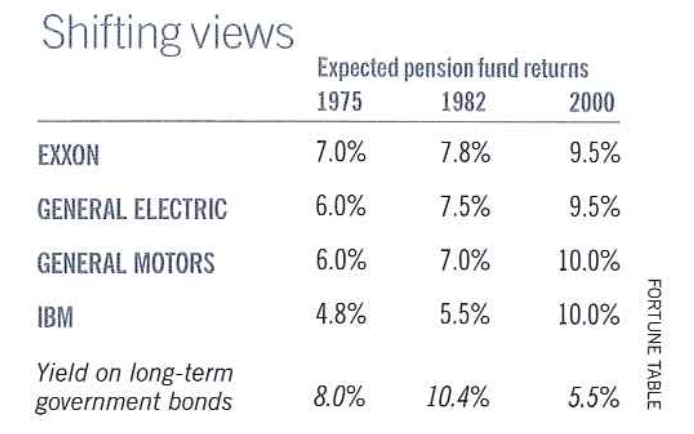 As the table shows, expectations in 1975 were modest: 7% for Exxon, 6% for GE and GM, and under 5% for IBM. The oddity of these assumptions is that investors could then buy long-term government noncallable bonds that paid 8%. In other words, these companies could have loaded up their entire portfolio with 8% no-risk bonds, but they nevertheless used lower assumptions. By 1982, as you can see, they had moved up their assumptions a little bit, most to around 7%. But now you could buy long-term governments at 10.4%. You could in fact have locked in that yield for decades by buying so-called strips that guaranteed you a 10.4% reinvestment rate. In effect, your idiot nephew could have managed the fund and achieved returns far higher than the investment assumptions corporations were using.