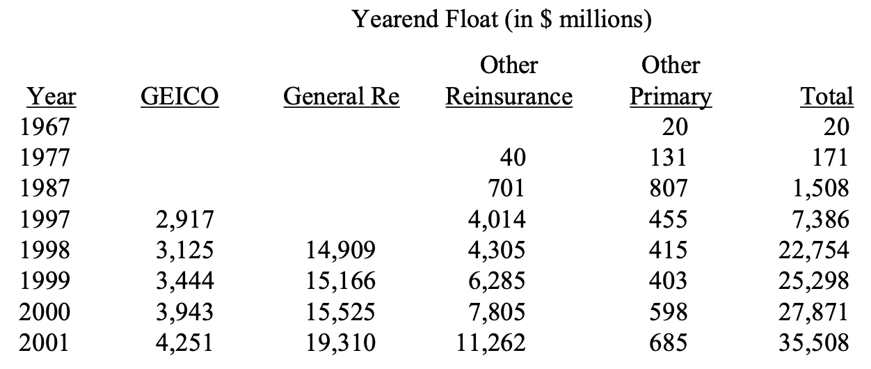 Historically, Berkshire has obtained its float at a very low cost. Indeed, our cost has been less than zero in about half of the years in which we’ve operated; that is, we’ve actually been paid for holding other people’s money. Over the last few years, however, our cost has been too high, and in 2001 it was terrible.