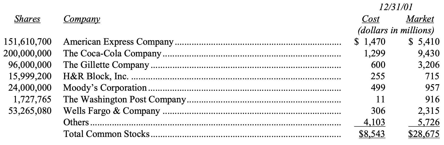 2001 年我们对投资组合几乎没有做什么调整。总体而言,我们较大的持仓在过去几年表现不佳,其中一些原因是经营业绩令人失望。Charlie 和我仍然喜欢我们所持有的所有公司的基本业务。但我们并不认为 Berkshire 的股票投资组合整体被低估。