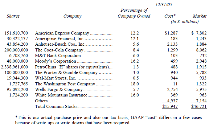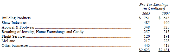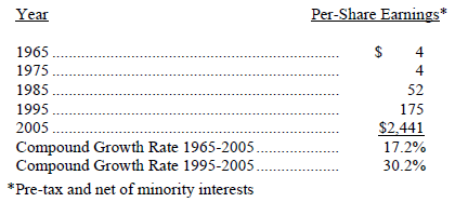 我们在 2005 年的净资产增加了 56 亿美元,使我们的 Class A 和 Class B 股票每股账面价值都提高了 6.4%。过去 41 年(即现任管理层接手以来),账面价值从 19 美元增长到 59,377 美元,年复合增长率为 21.5%。*