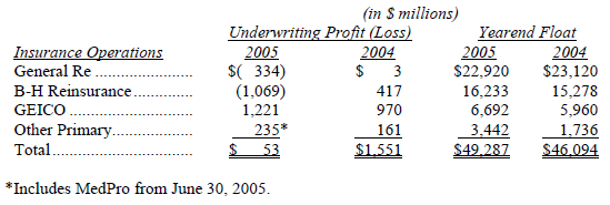 In 2004 our float cost us less than nothing, and I told you that we had a chance — absent a mega-catastrophe — of no-cost float in 2005. But we had the mega-cat, and as a specialist in that coverage, Berkshire suffered hurricane losses of $3.4 billion. Nevertheless, our float was costless in 2005 because of the superb results we had in our other insurance activities, particularly at GEICO.