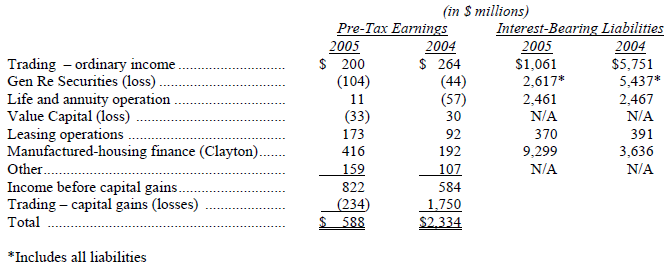 We have major reinsurance operations at General Re and National Indemnity. The former is run by Joe Brandon and Tad Montross, the latter by Ajit Jain. Both units performed well in 2005 considering the extraordinary hurricane losses that battered the industry.