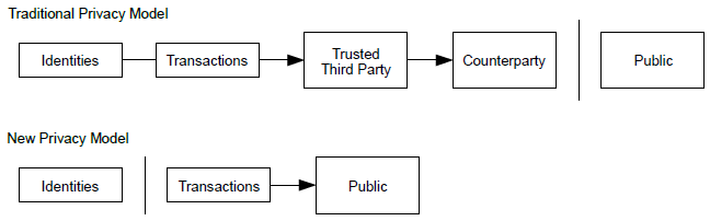 传统银行模型通过限制信息访问范围(只让交易双方与受信任第三方可见)来实现一定程度的隐私。必须公开宣布所有交易这一要求,使得这种方法无法使用;但隐私仍可通过在另一个位置“打断信息流”来维持:保持公钥(public keys)的匿名性。公众能看到“有人给另一个人转了一笔金额”,但缺乏把交易与具体身份关联起来的信息。这类似于证券交易所发布的信息水平:单笔交易的时间与规模(the "tape")是公开的,但不会披露交易双方是谁。