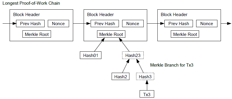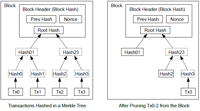 Once the latest transaction in a coin is buried under enough blocks, the spent transactions before it can be discarded to save disk space. To facilitate this without breaking the block's hash, transactions are hashed in a Merkle Tree257, with only the root included in the block's hash. Old blocks can then be compacted by stubbing off branches of the tree. The interior hashes do not need to be stored.