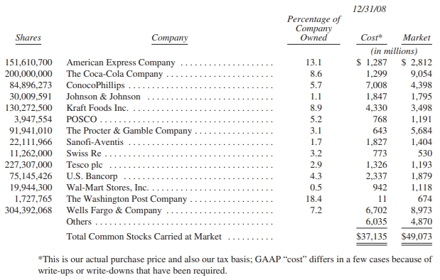 We purchased 15% of Moody’s some years ago and have not since bought a share. Moody’s, though, has repurchased its own shares and, by late 2008, those repurchases reduced its outstanding shares to the point that our holdings rose above 20%. Burlington Northern has also repurchased shares, but our increase to 20% primarily occurred because we continued to buy this stock.
