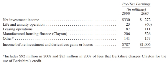 In 2008, our investments fell from $90,343 per share of Berkshire (after minority interest) to $77,793, a decrease that was caused by a decline in market prices, not by net sales of stocks or bonds. Our second segment of value fell from pre-tax earnings of $4,093 per Berkshire share to $3,921 (again after minority interest).