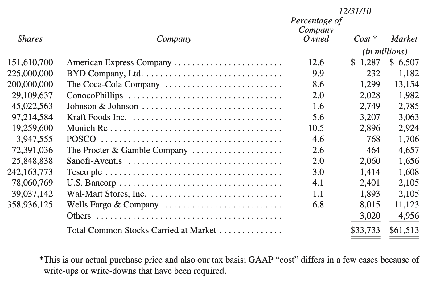在 2010 年,我们的 Class A 和 Class B 股票每股账面价值均增长了 13%。在过去 46 年里(也就是自现任管理层接手以来),每股账面价值已从 19 美元增至 95,453 美元,按年复合计算的增长率为 20.2%*。