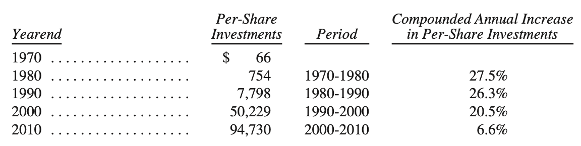 The following tables illustrate this shift. In the first table, we present per-share investments at decade intervals beginning in 1970, three years after we entered the insurance business. We exclude those investments applicable to minority interests.