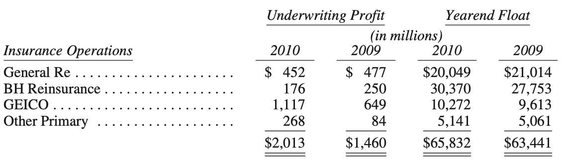 当然,“一个正常的年度”并不是我本人或我的合伙人、伯克希尔副董事长 Charlie Munger 能够精确界定的概念。但在估算我们当前盈利能力的目的下,我们所设想的“正常年度”,是指保险业务没有发生特大灾难、整体商业环境略优于 2010 年、但又弱于 2005 年或 2006 年的那种年份。基于这些假设,以及我将在“Investment”部分说明的若干其他假设,我估计我们目前所拥有资产的正常盈利能力约为税前 170 亿美元、税后 120 亿美元,这还不包括任何资本利得或损失。Charlie 和我每天都在思考如何在这一基础上继续扩展和提升。