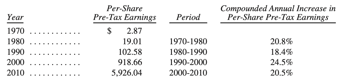 The per-share book value of both our Class A and Class B stock increased by 13% in 2010. Over the last 46 years (that is, since present management took over), book value has grown from $19 to $95,453, a rate of 20.2% compounded annually.*
