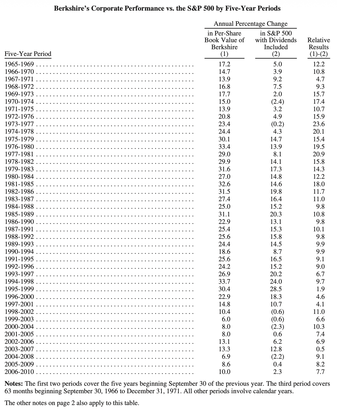 To provide you a longer-term perspective on performance, we present on the facing page the yearly figures from page 2 recast into a series of five-year periods. Overall, there are 42 of these periods, and they tell an interesting story. On a comparative basis, our best years ended in the early 1980s. The market’s golden period, however, came in the 17 following years, with Berkshire achieving stellar absolute returns even as our relative advantage narrowed.