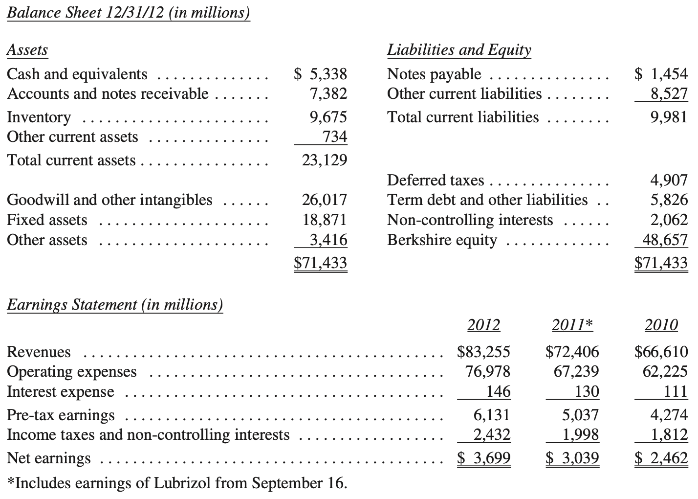 Now, let’s examine the four major sectors of our operations. Each has vastly different balance sheet and income characteristics from the others. Lumping them together therefore impedes analysis. So we’ll present them as four separate businesses, which is how Charlie and I view them.