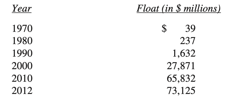 财产意外险(“P/C”)保险公司先收取保费、后支付赔款。在极端情况下(例如某些工伤赔偿事故),赔付期可延续数十年。这种“先收、后付”的模式使我们持有大量资金——我们称之为“float”(浮存金)——最终将付诸他人。与此同时,我们可以将这笔浮存金用于 Berkshire 的投资收益。虽然单个保单与赔案此起彼伏,但相对于保费规模,我们持有的浮存金金额相当稳定。因此,随着业务增长,我们的浮存金也随之增长。我们的增长情况如何,见下表所示: