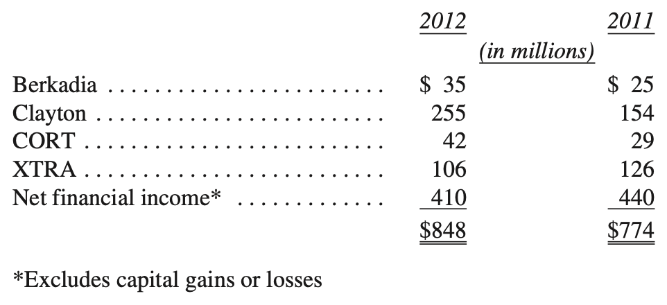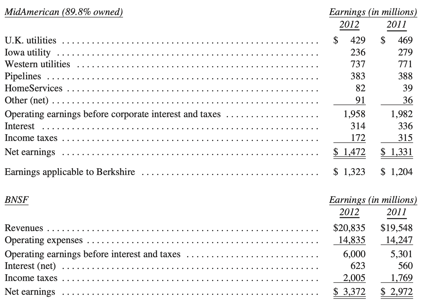 + Last year I told you that BNSF, Iscar, Lubrizol, Marmon Group and MidAmerican Energy – our five most profitable non-insurance companies – were likely to earn more than $10 billion pre-tax in 2012. They delivered. Despite tepid U.S. growth and weakening economies throughout much of the world, our “powerhouse five” had aggregate earnings of $10.1 billion, about $600 million more than in 2011.