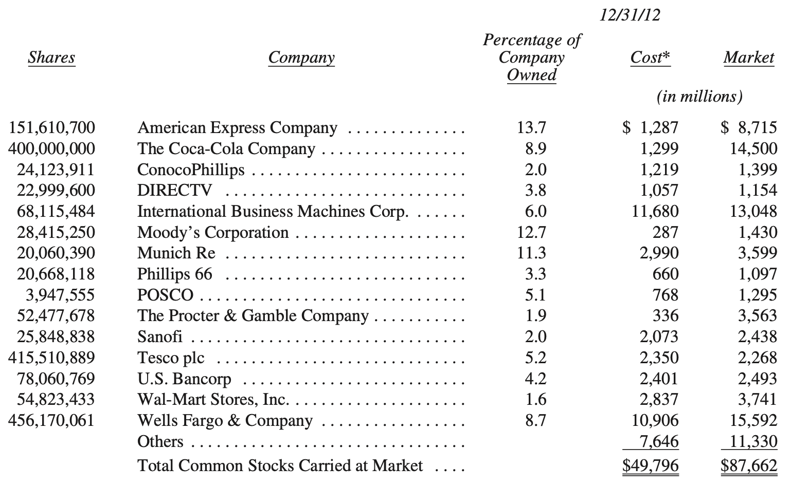按年末的持股数量计算,我们分享“四大”在2012年的利润为39亿美元。但在对你们披露的收益里,我们只计入已收取的股息——约11亿美元。别搞错:那未计入报表的28亿美元利润对我们而言,价值丝毫不逊于已经记录的部分。