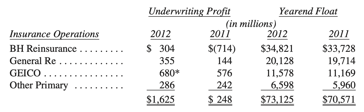 不幸的是,所有保险公司都想达成这种美好结果,这就引发了激烈竞争;多数年份里竞争之猛烈,导致整个财险行业处于显著的承保亏损状态。实质上,这种亏损就是行业为持有其浮存金所支付的“成本”。例如,State Farm 作为全美规模最大的保险公司,同时管理良好,在截至 2011 年的 11 年中有 8 年出现了承保亏损(其 2012 年的财务数据尚未公布)。在保险业里,有很多亏钱的方式,而且行业从未停止发明新的方式。