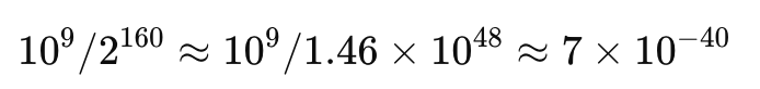 这里有一个问题是私钥 k是随机生成的,那么有没有可能碰巧生成某个已用地址?其中概率有多大?假设已经用过的地址是10^9(10 亿),碰巧碰撞的概率如下: