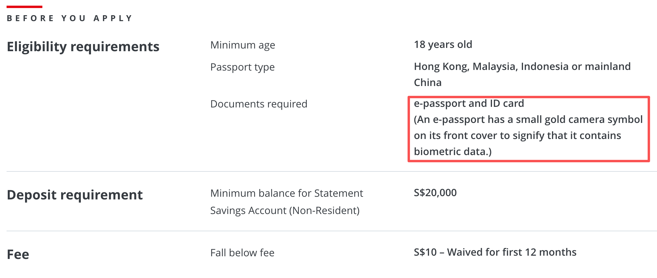 - HSBC Premier,要求20万新币的存款或者投资,HSBC Premier没有International的版本,采用的办法稍有不同,如果已经是某个地方的HSBC Premier就可以申请其他区域的Premier账户(包括新加坡),参考:《HSBC Premier》;