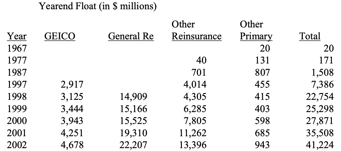 "任何公司的盈利水平都取决于三个方面:(1) 资产收益;(2) 负债成本;(3) "杠杆 "的使用,即资产由负债而非股本提供资金的程度。多年来,我们在第 1 点上做得很好,资产回报率很高。但我们也从中受益匪浅,因为我们的负债成本很低,这一点一般人还不太了解。成本低的一个重要原因是,我们以非常有利的条件获得了浮存金"。